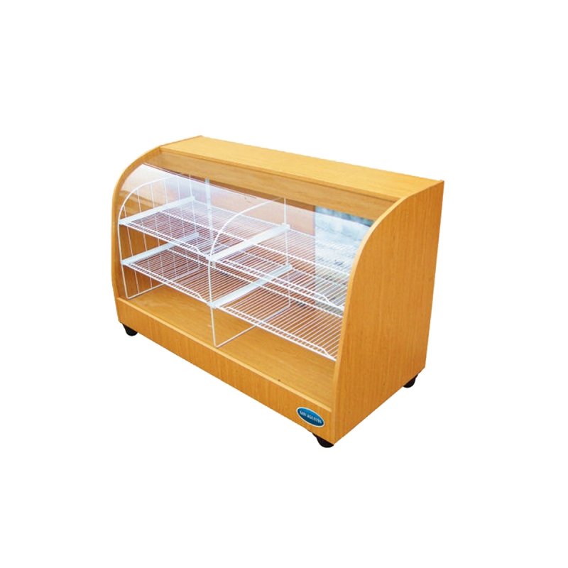 Su estructura con terminación símil roble aporta una estética cálida y elegante al local, mientras que los estantes internos y puertas corredizas traseras facilitan el acceso y la organización de las bandejas durante la atención.